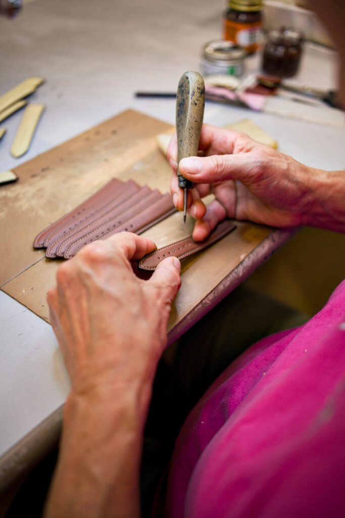 - Cucitura Artigianale: Le cuciture, che siano decorative o strutturali, vengono eseguite da artigiani esperti. Questo passaggio è cruciale per la resistenza e l’estetica del cinturino.