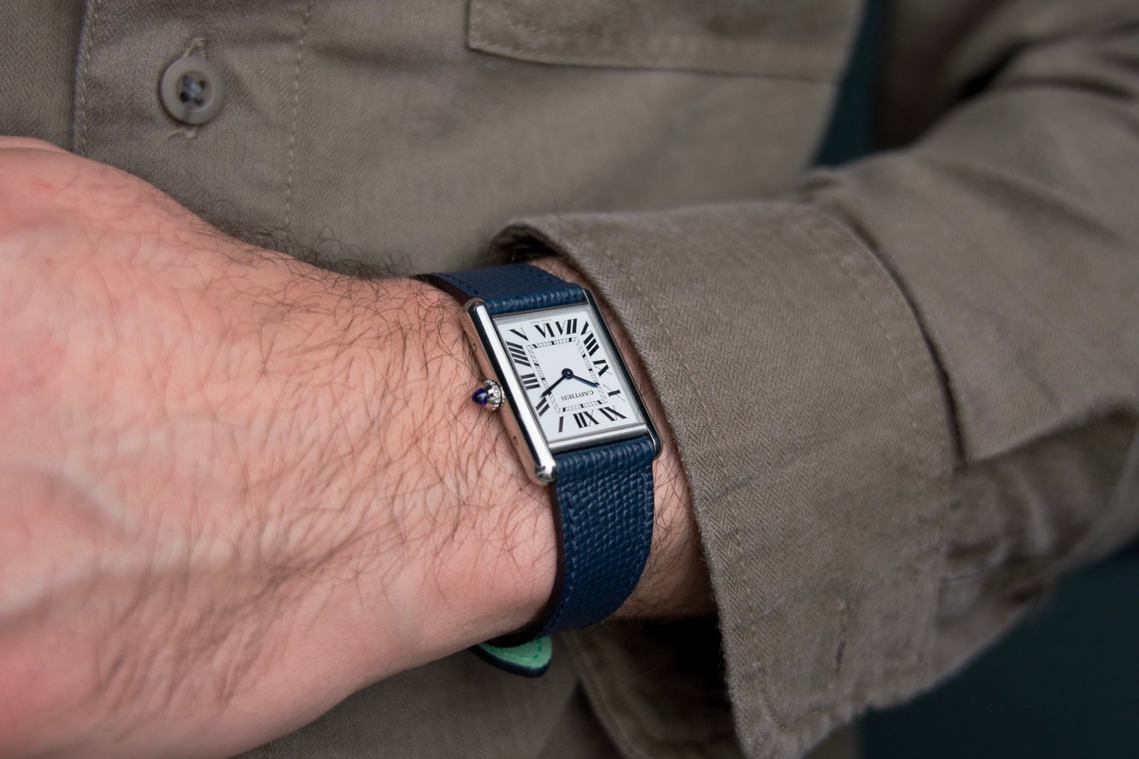 La qualità di questo cinturino si percepisce in ogni dettaglio. Il blu profondo è una scelta di classe che richiama elegantemente il cabochon blu zaffiro sulla corona del Tank, creando un abbinamento cromatico impeccabile. La finitura martellata della vera pelle italiana aggiunge profondità e carattere, elevando il look dell’orologio con un tocco di originalità. Il sistema “quick release” permette di sostituire il cinturino in pochi secondi, senza bisogno di attrezzi.