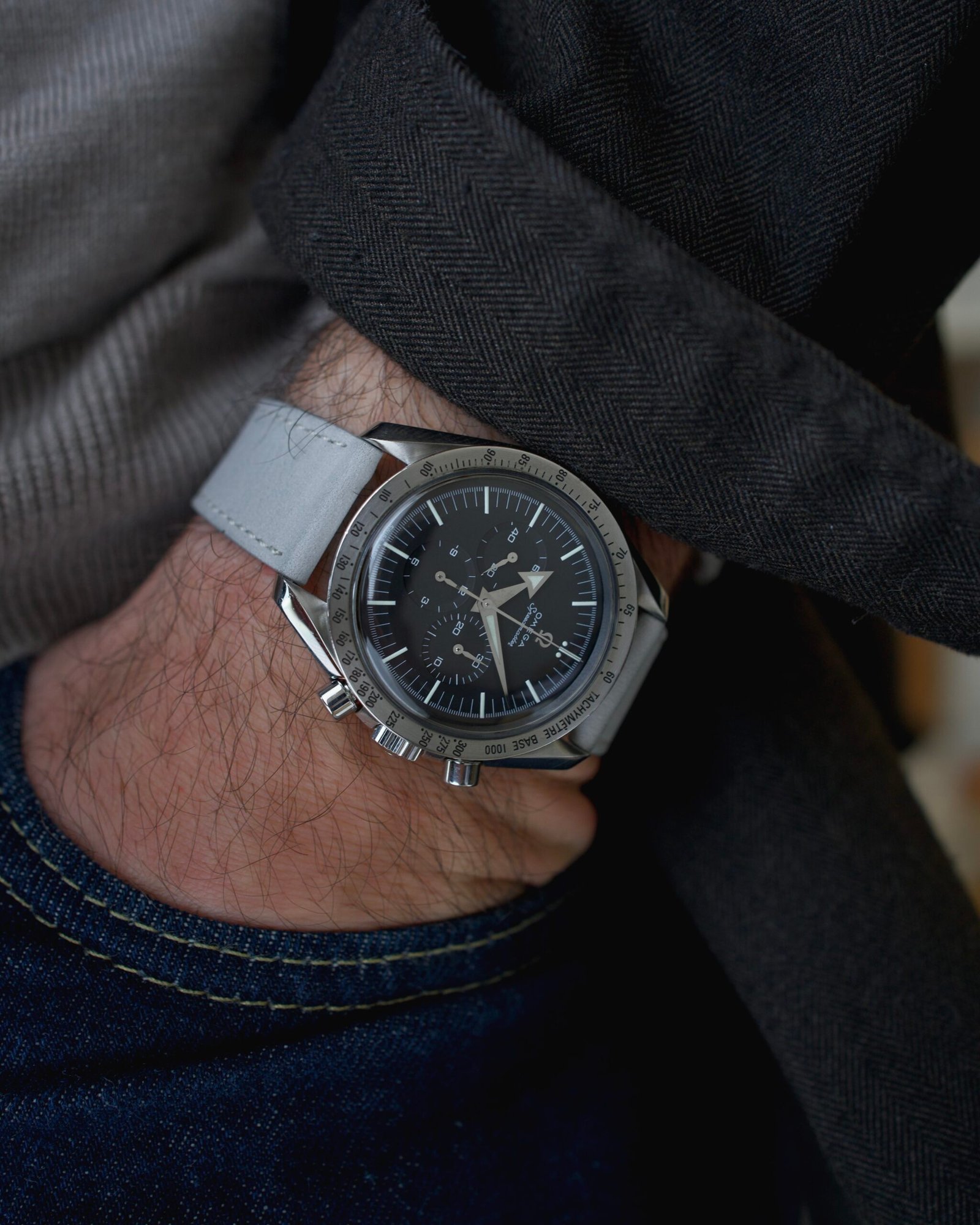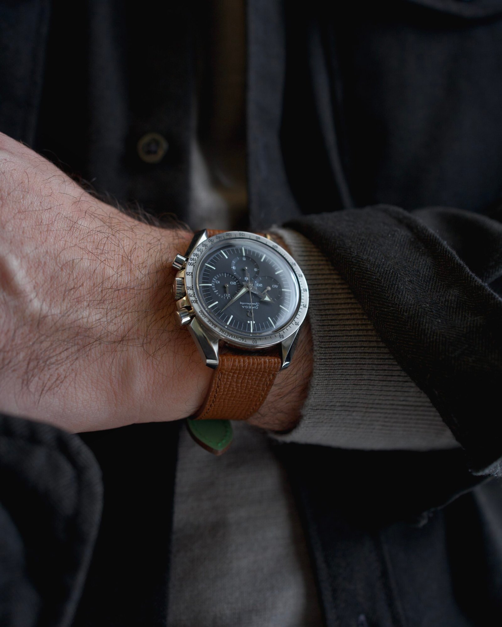 Se l’obiettivo è catturare l’essenza vintage del 1957, il cinturino Milano in pelle martellata marrone chiaro è la scelta obbligata. La texture granulosa della pelle martellata dialoga perfettamente con l’aspetto “tool watch” dello Speedmaster, mentre il colore caldo del marrone chiaro crea un contrasto spettacolare con il quadrante nero opaco e la lunetta in acciaio freddo. È l’abbinamento che trasforma il Broad Arrow in un compagno di avventure perfetto per un outfit casual-chic, richiamando l’estetica dei piloti da corsa degli anni ’50.