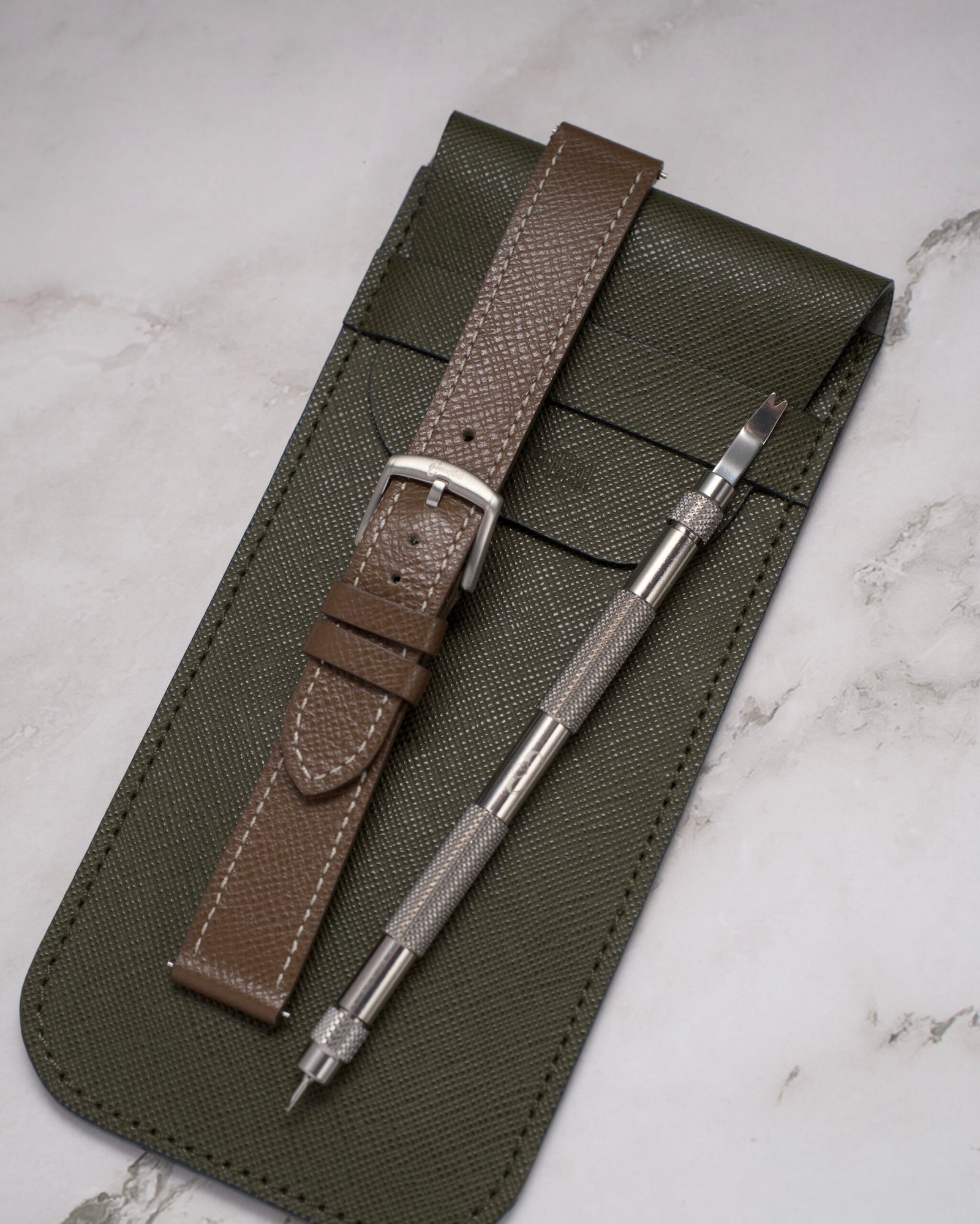 Per custodire il tuo nuovo cinturino e gli altri che possiedi, abbiamo incluso la nostra pratica ed elegante pochette da viaggio. Realizzata in raffinata pelle Saffiano, è famosa per la sua incredibile resistenza a graffi, macchie e acqua. L’interno è studiato per contenere il tuo orologio o i tuoi occhiali da sole. Garantendo che i tuoi accessori siano sempre organizzati e protetti, sia a casa che in viaggio.